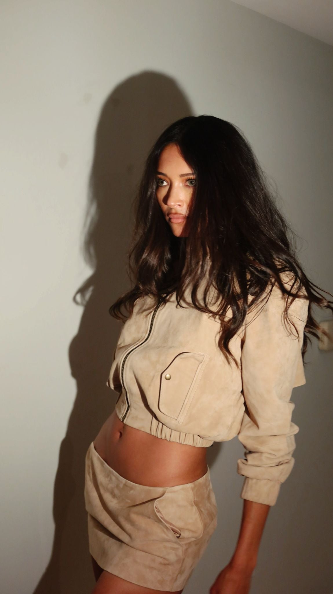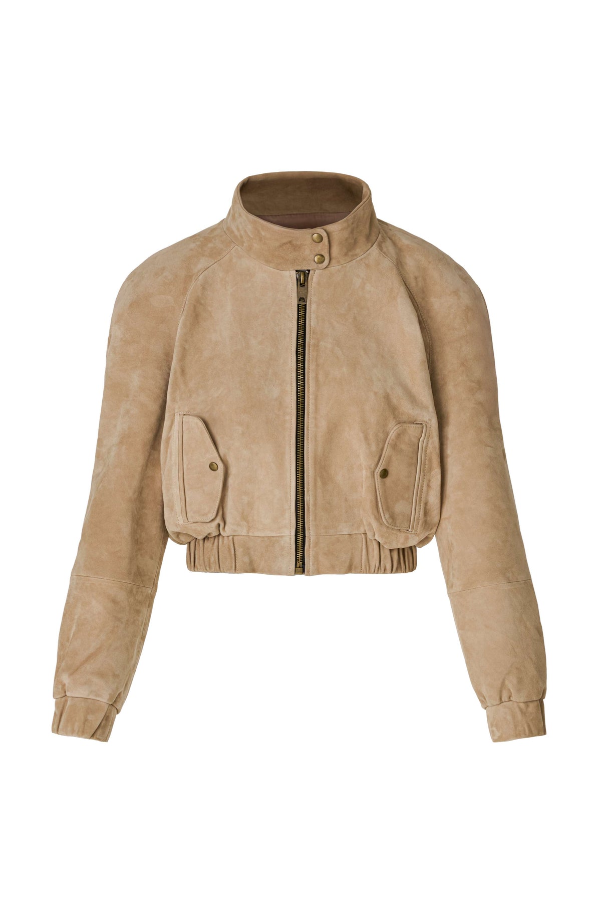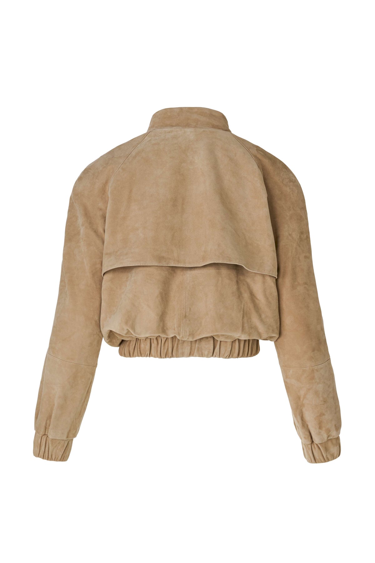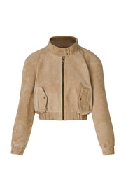 Crafted from luxurious camel suede, this cropped bomber jacket brings timeless sophistication with a modern edge. Designed with a structured high collar, front zip closure, and functional flap pockets with snap buttons, it balances elegance and everyday versatility. The elastic hem and cuffs ensure a comfortable, tailored fit, while the back overlay detail adds a unique, fashion-forward touch.