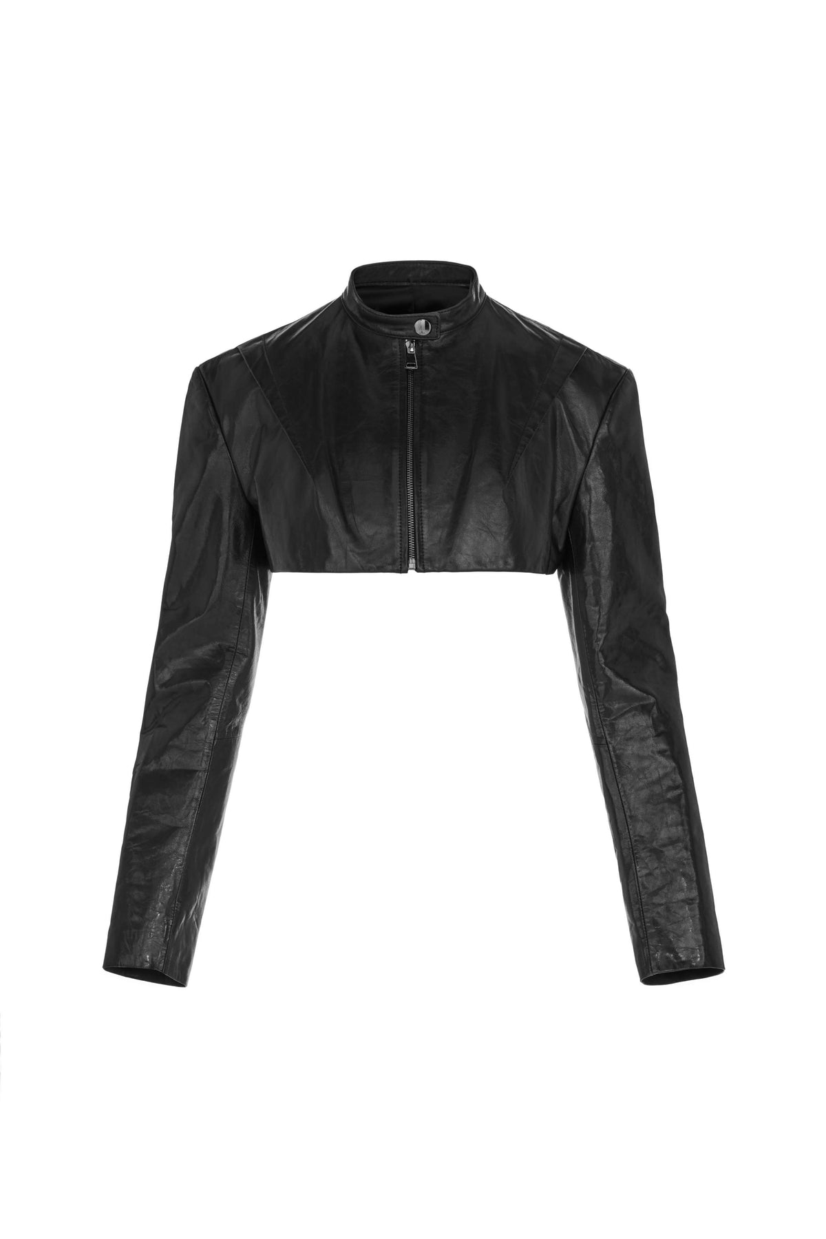 • Details: Stand collar, front zip closure, minimalist cropped cut