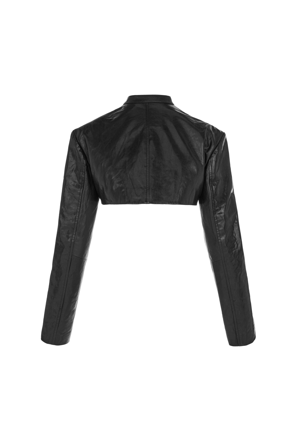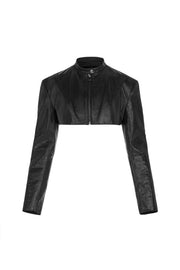 The Cropped Leather Bolero Jacket is a bold statement piece designed to elevate any look. Crafted from high-quality leather, it features a sleek cropped silhouette, clean tailoring, and a modern stand collar. The front zip closure adds a sharp, contemporary finish, making it perfect for layering over evening pieces or high-waisted styles.