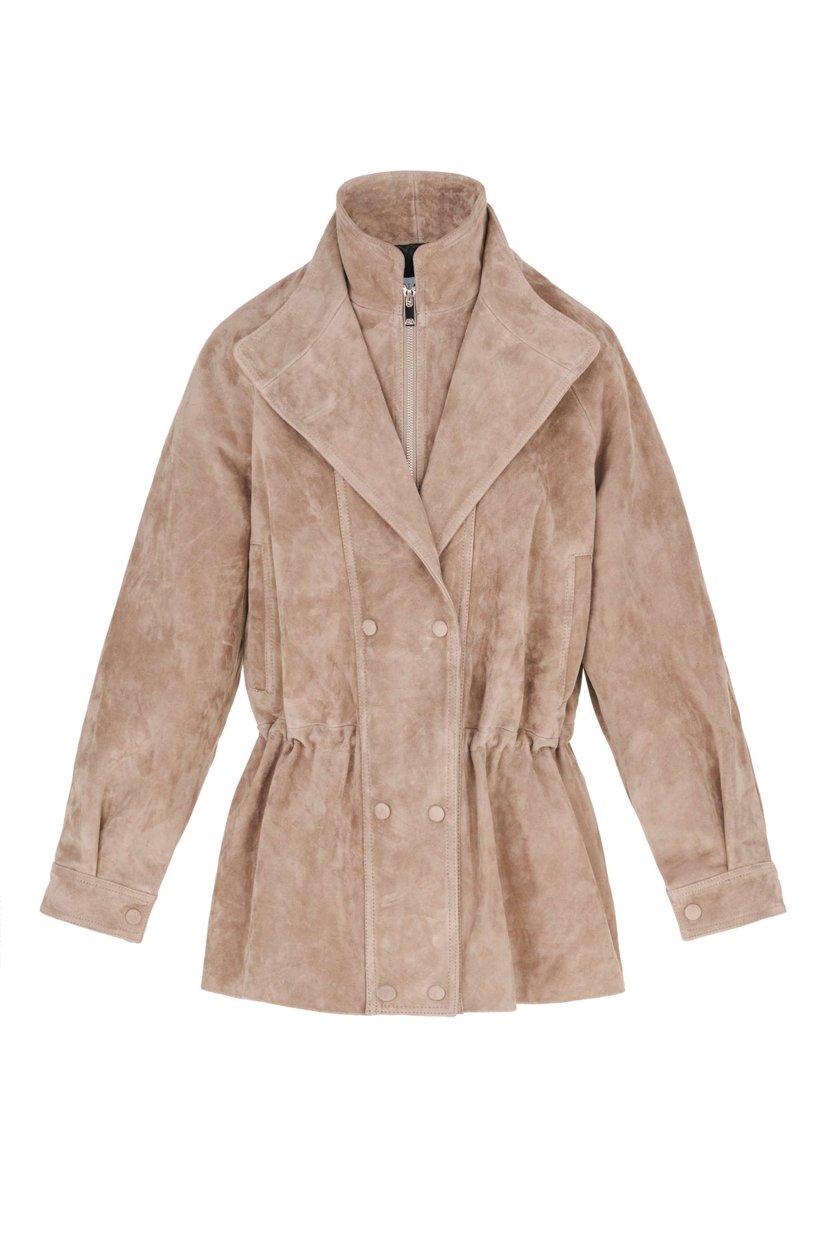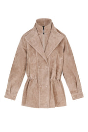 This taupe suede leather jacket blends sophistication and effortless style. Designed with a cinched waistline for a feminine, flattering fit, it features a double-breasted front with hidden snap buttons and a sleek zipper detail at the collar for a modern twist.
