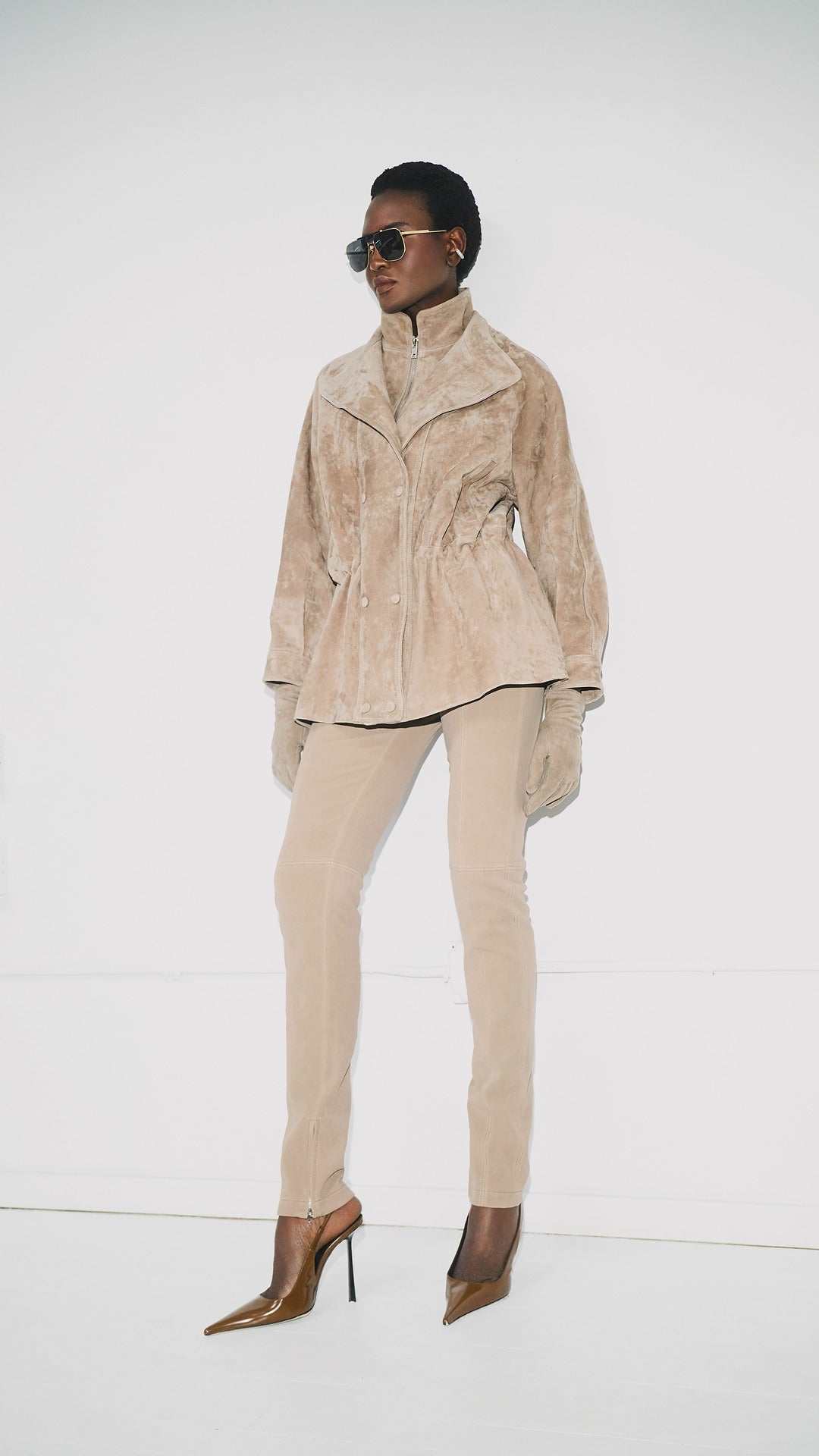 The soft, premium suede provides a luxurious texture, making it perfect for layering across seasons. Its structured silhouette and neutral tone ensure timeless versatility, whether styled casually or dressed up.