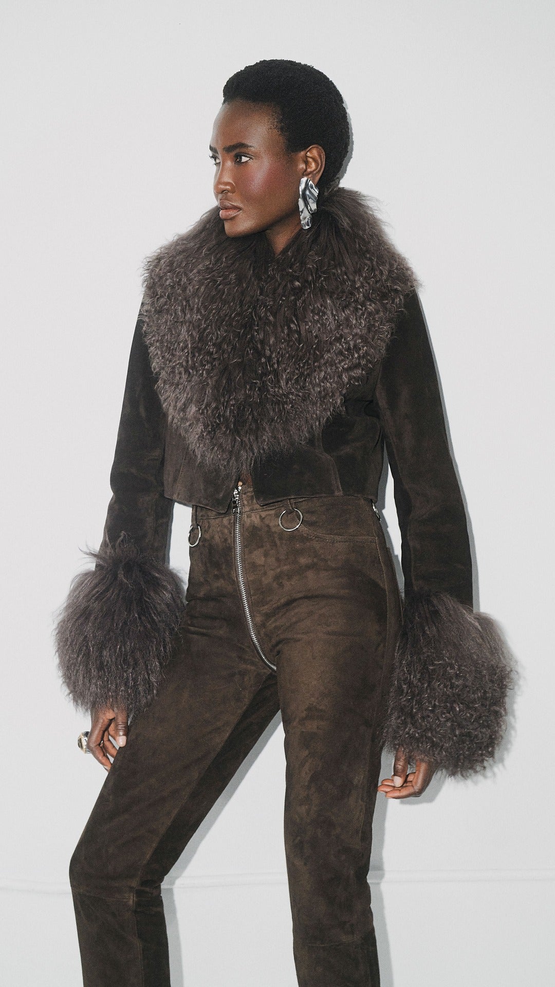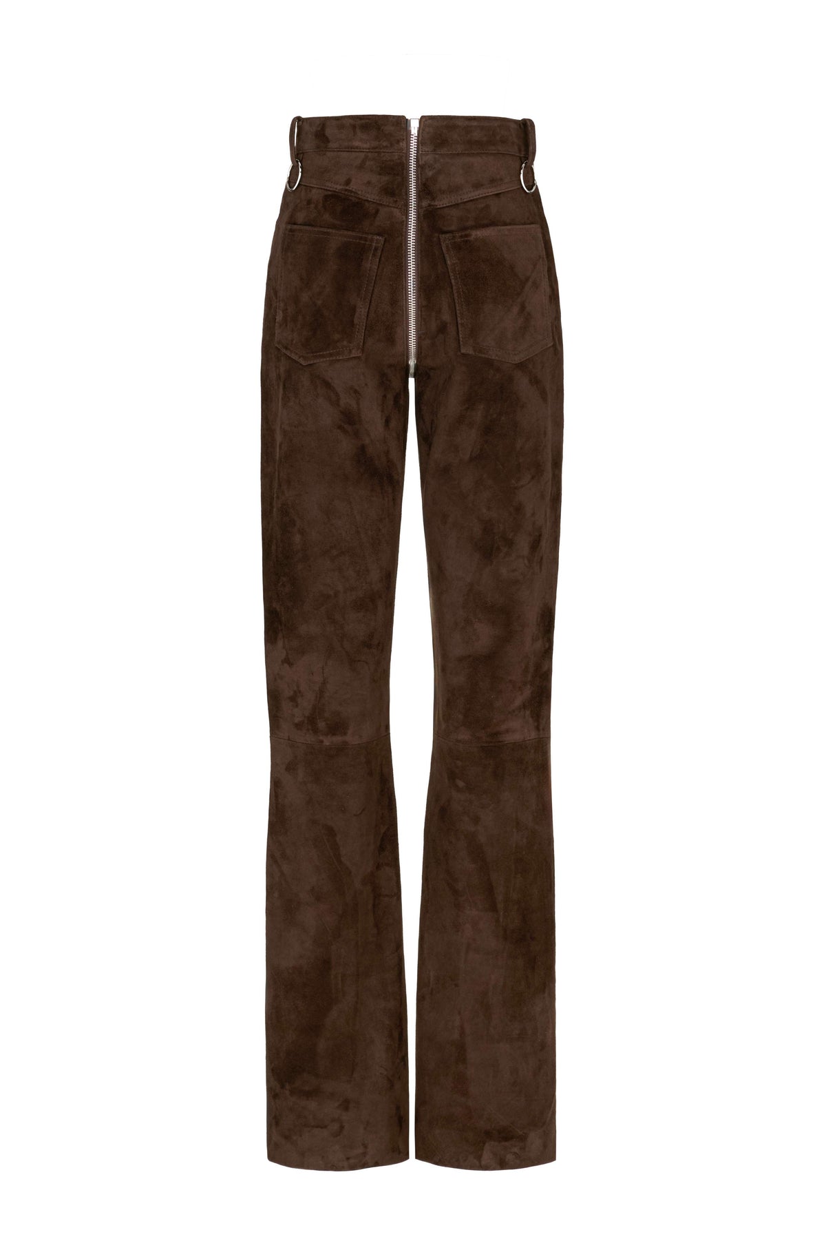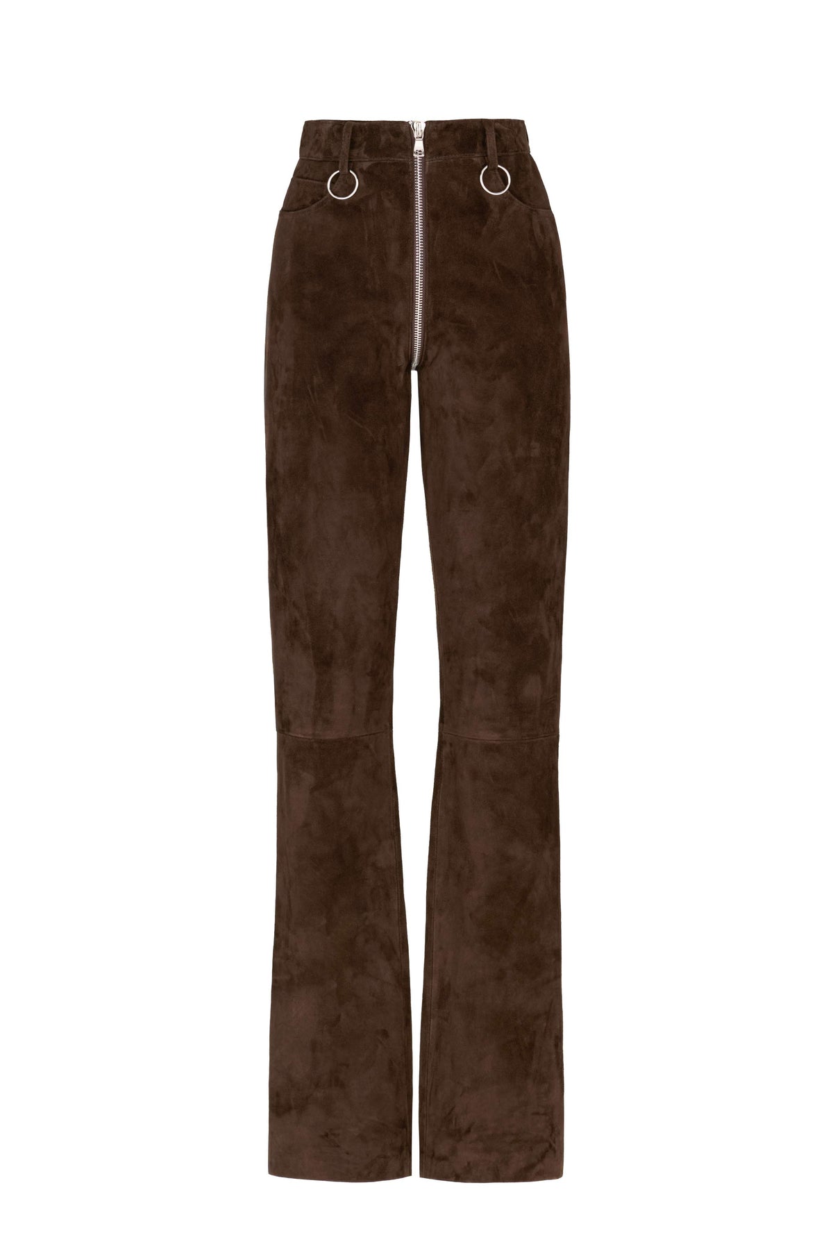 Crafted from luxurious genuine suede, these pants feature a high-waist fit and a slight flare for a sleek, elongating silhouette. The front and back zipper design with ring-pull details adds a modern, edgy touch, while the rich brown tone brings depth and sophistication.