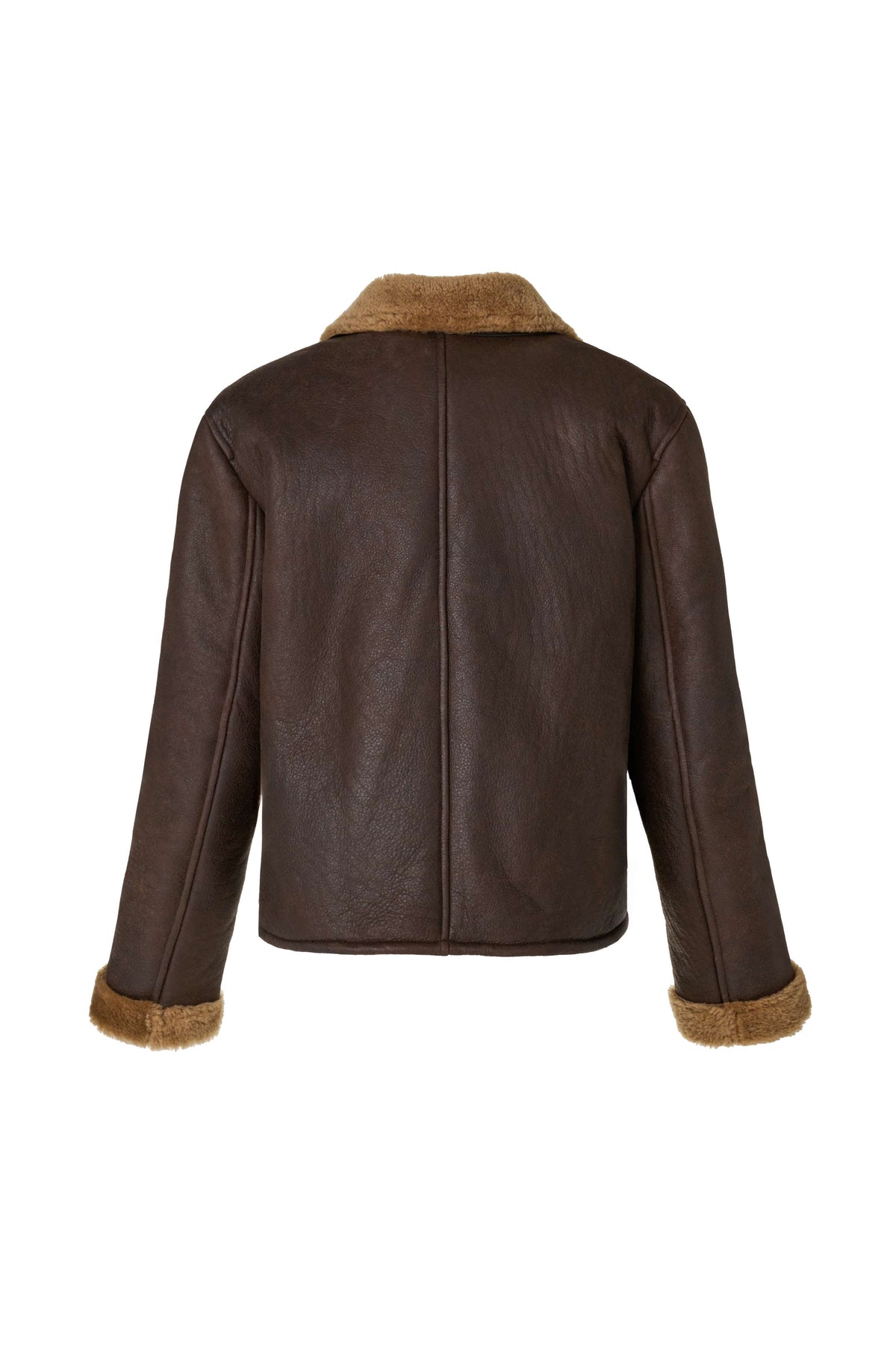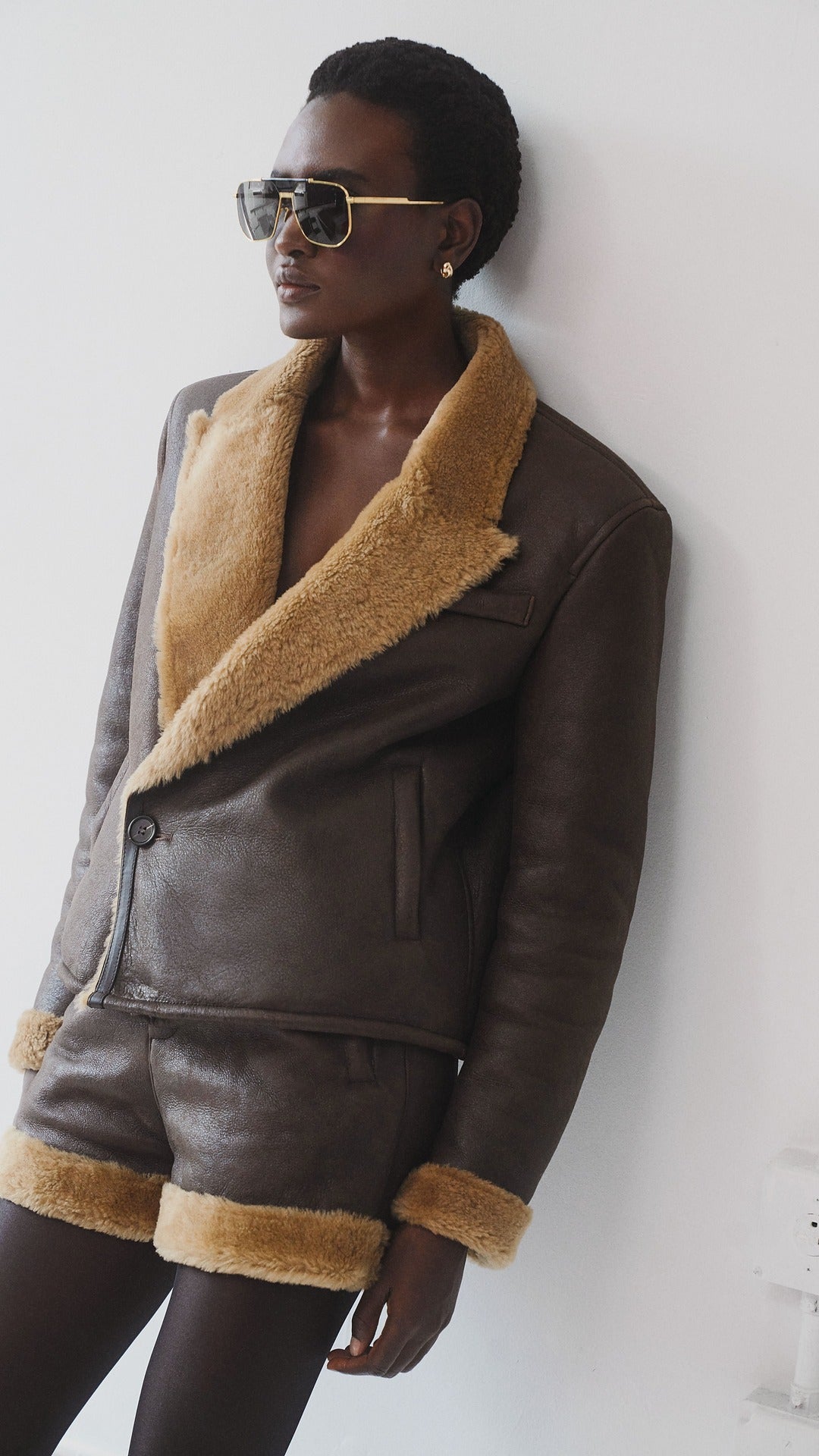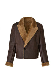 Stay warm while exuding effortless style with this luxury shearling jacket. Crafted from premium brown leather, it features a plush camel shearling lining that extends to the wide lapel collar and turned-up cuffs. The clean, structured design with a single-button front closure creates a timeless silhouette, making it a versatile statement piece for both casual and elevated looks.