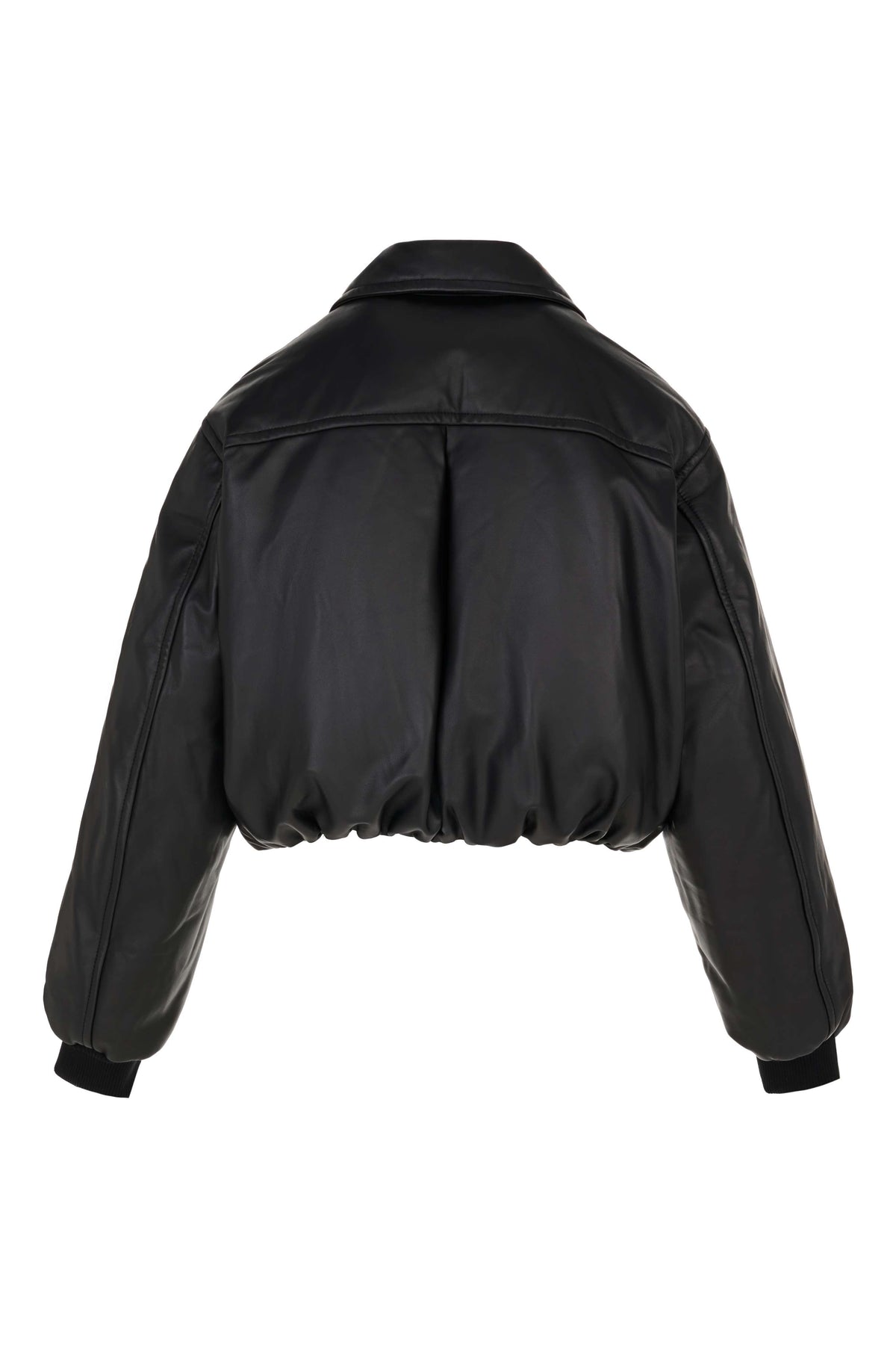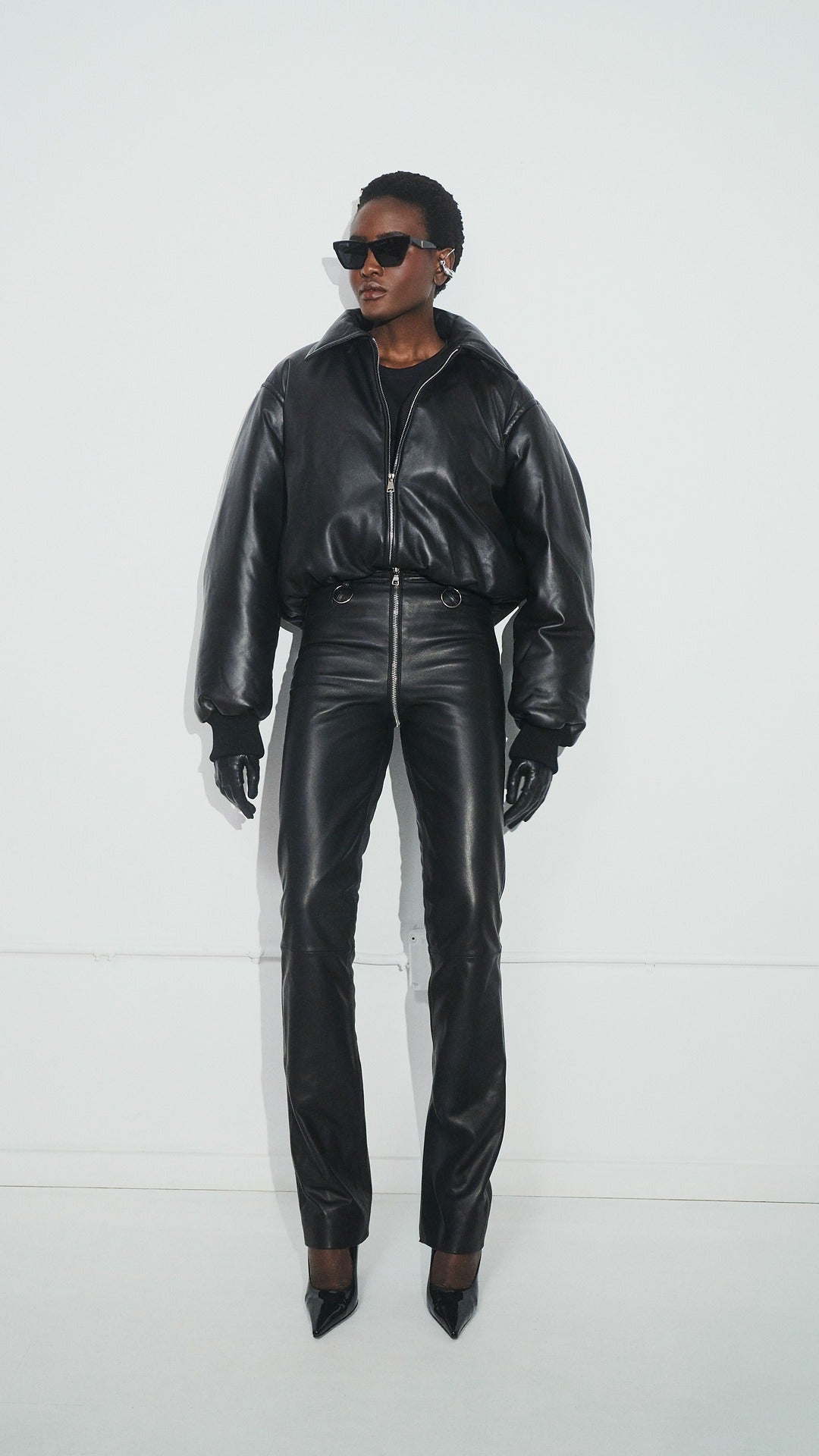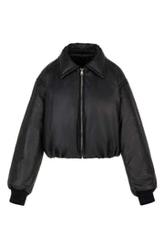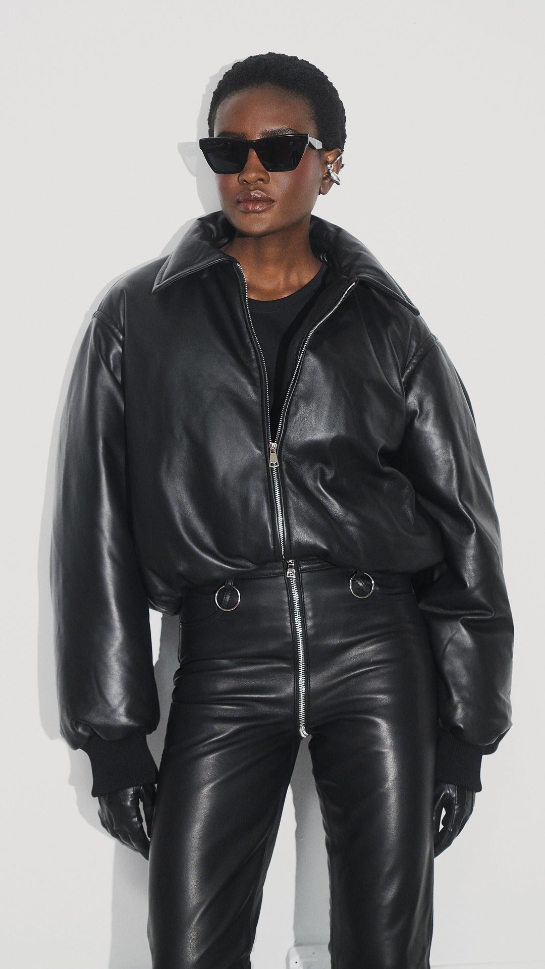 This cropped black leather jacket brings a modern edge to a classic silhouette. Featuring a minimalist zip-front design and a cinched elastic hem, it delivers a flattering, contemporary fit. The oversized sleeves with ribbed cuffs add a touch of streetwear chic, while the smooth, premium leather finish offers a sleek, high-fashion look.