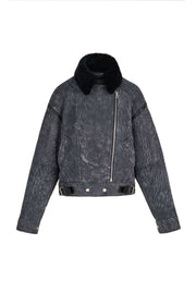 A modern reinterpretation of a classic, this aviator-style jacket is crafted from premium shearling leather for a bold, structured look. The deep charcoal body is contrasted by a plush black shearling collar, creating a sleek yet functional piece perfect for colder days. Featuring an asymmetrical zip closure, adjustable waist buckles, and tailored seams, this jacket blends luxury craftsmanship with utilitarian edge.