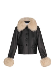 Sophisticated and timeless, this luxury cropped jacket combines sleek black leather with plush, soft beige fur details. The contrast between the smooth leather body and voluminous fur collar and cuffs creates a striking, high-fashion aesthetic. Featuring a structured silhouette and elegant front button closure, this piece transitions effortlessly from daytime chic to evening glamour.