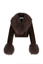 Elevate your winter wardrobe with this luxurious cropped jacket, crafted from premium brown suede leather and adorned with voluminous Mongolian shearling at the oversized collar and dramatic cuffs. Designed for both warmth and style, this standout piece exudes a timeless, vintage-inspired allure with a modern, high-fashion edge. Perfect for layering over evening wear or chic daytime looks, it brings sophistication and boldness to any outfit.