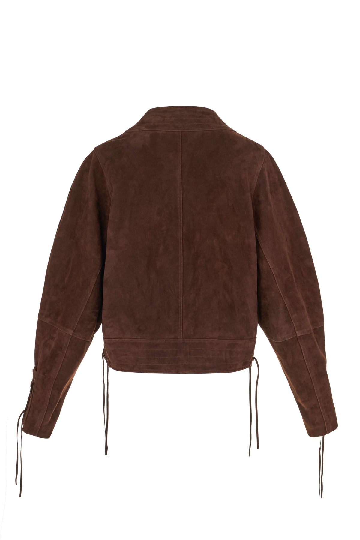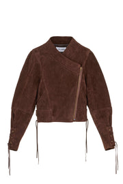 This asymmetrical moto jacket combines bold design with understated luxury. Crafted from premium suede leather, it features a diagonal front zipper closure, lace-up sleeve details, and adjustable side ties for a customized fit. The rich cognac brown color adds warmth and sophistication, making it a versatile piece that transitions seamlessly from day to night.